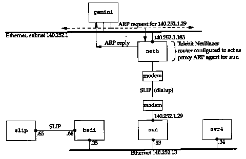 When some other host on the subnet 140.252.1 (say, gemini) has an IP datagram to send to sun at address 140.252.1.29, gemini compares the network ID (140.252) and subnet ID (1) and since they are equal, issues an ARP request on the top Ethernet in Figure 4.6 for IP address 140.252.1.29. The router netb recognizes this IP address as one belonging to one of its dialup hosts, and responds with the hardware address of its Ethernet interface on the cable 140.252.1. The host gemini sends the IP datagram to netb across the Ethernet, and netb forwards the datagram to sun across the dialup SLIP link. This makes it transparent to all the hosts on the 140.252.1 subnet that host sun is really configured "behind" the router netb.