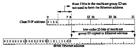 This allocation allows for 23 bits in the Ethernet address to correspond to the IP multicast group ID. The mapping places the low-order 23 bits of the multicast group ID into these 23 bits of the Ethernet address. This is shown in Figure 12.3.