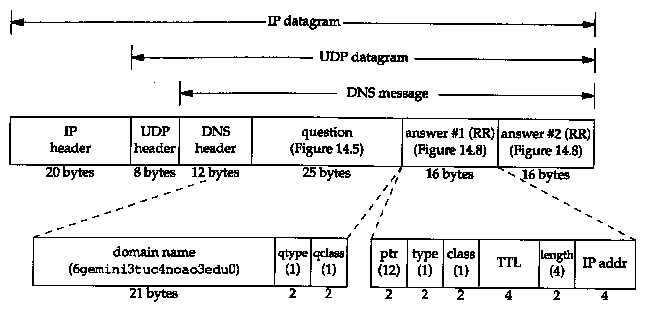 Figure 14.11 shows the format of the DNS reply, line 2 from Figure 14.10. We also show the IP and UDP headers to reiterate that DNS messages are normally encapsulated in UDP datagrams. We explicitly show the count bytes in the labels of the domain name in the question. The two answers returned are the same, except for the different IP addresses returned in each answer. In this example the pointer in each answer would have a value of 12, the offset from the start of the DNS header of the complete domain name.