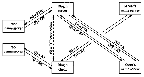 Let's look at another example that ties together many of the DNS features that we've described. We start an Rlogin client, connecting to an Rlogin server in some other domain. Figure 14.16 shows the exchange of packets that takes place.
