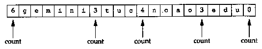 to 63 bytes. (We'll see later in this section that a count byte with the two high-order bits turned on, values 192 to 255, is used with a compression scheme.) Unlike many other message formats that we've encountered, this field is allowed to end on a boundary other than a 32-bit boundary. No padding is used. Figure 14.6 shows how the domain name gemini.tuc.noao.edu is stored.