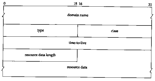 The final three fields in the DNS message, the answers, authority, and additional information fields, share a common format called a resource record or RR. Figure 14.8 shows the format of a resource record.