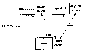 Let's start with a simple example to see the communication between a resolver and a name server. We'll run the Telnet client on the host sun to the host gemini, connecting to the daytime server: