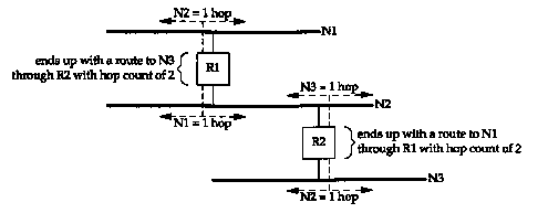 Router Rl advertises a route to N2 with a hop count of 1 by sending a broadcast on Nl. (It makes no sense to advertise a route to Nl in the broadcast sent on Nl.) It also advertises a route to Nl with a hop count of 1 by sending a broadcast on N2. Similarly, R2 advertises a route to N2 with a metric of 1, and a route to N3 with a metric of 1.