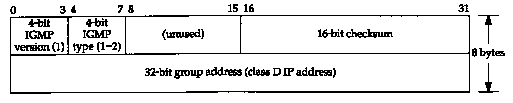 The IGMP version is 1. An IGMP type of 1 is a query sent by a multicast router, and 2 is a response sent by a host. The checksum is calculated in the same manner as the ICMP checksum.