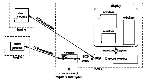 The X Window System, or just X, is a client-server application that lets multiple clients (applications) use the bit-mapped display managed by a server. "The server is the software that manages a display, keyboard, and mouse. The client is an application program that runs on either the same host as the server or on a different host. In the latter case the common form of communication between the client and server is TCP, although other protocols such as DECNET can be used. In some instances the server is a dedicated piece of hardware (an X terminal) that communicates with clients on other hosts. In another instance, a stand-alone workstation, the client and server are on the same host and communicate using interprocess communication on that host, without any network involvement at all. Between these two extremes is a workstation that supports clients on the same host and clients on other hosts.