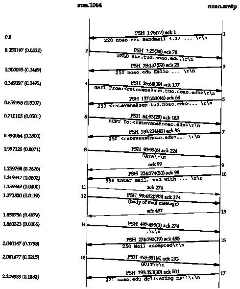 Figure 28.2 is a time line of the SMTP connection between the sender SMTP (the client) and the receiver SMTP (the server). We have removed the connection establishment and termination, and the window size advertisements.