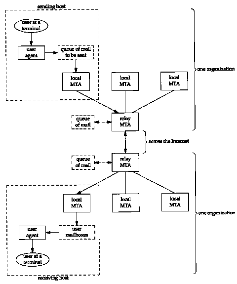 In this scenario there are four MTAs between the sender and receiver. The local MTA on the sender's host just delivers the mail to its relay MTA. (This relay MTA could have a hostname of mailhost in the organization's domain.) This communication uses SMTP across the organization's local internet. The relay MTA in the sender's organization then sends the mail to the receiving organization's relay MTA across the Internet. This other relay MTA then delivers the mail to the receiver's host, by communication with the local MTA on the receiver's host. All the MTAs in this example use SMTP, although the possibility exists for other protocols to be used.