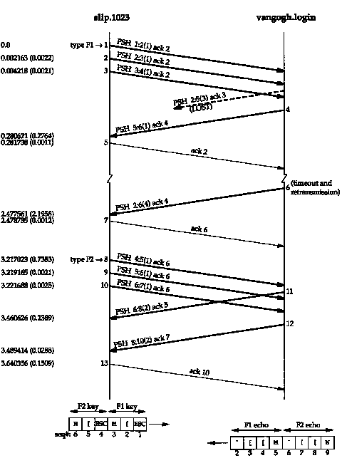 The same exchange occurs when the next special function key is typed (segments 6-10). As we expect, the time difference between segments 5 and 10 (slip sending the acknowledgment of the echo) is a multiple of 200 ms, since both ACKs are delayed.