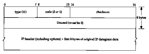 There are two different ICMP "time exceeded" messages (Figure 6.3), each with a different code field in the ICMP message. Figure 8.2 shows the format of this ICMP error message.
